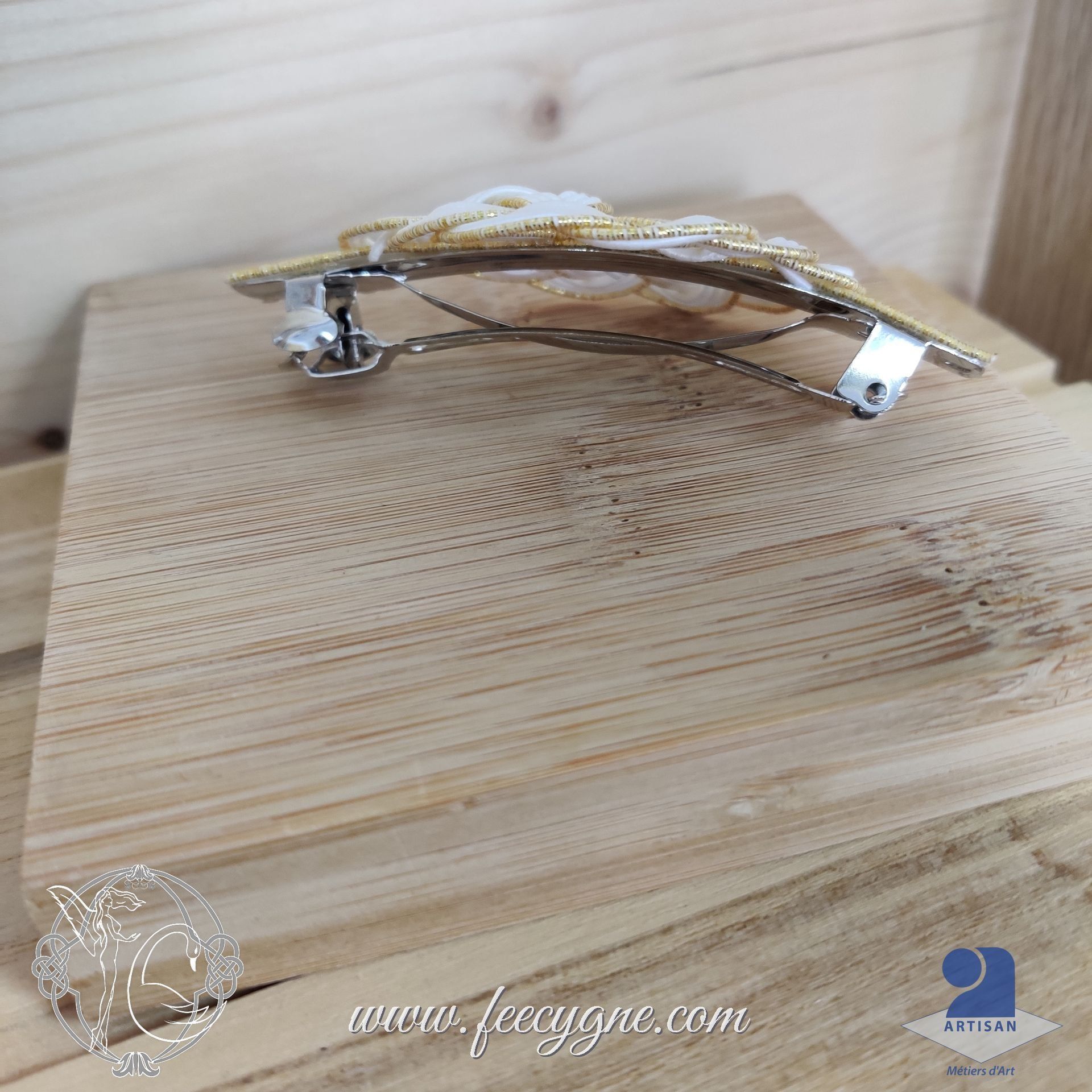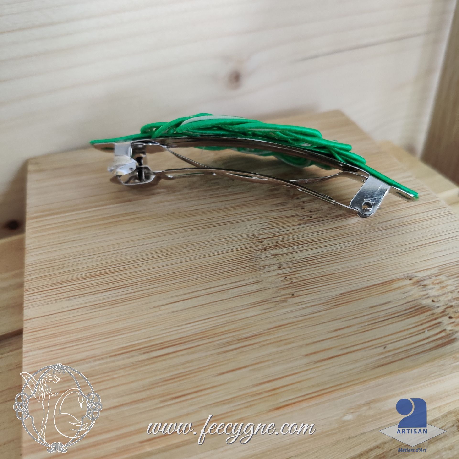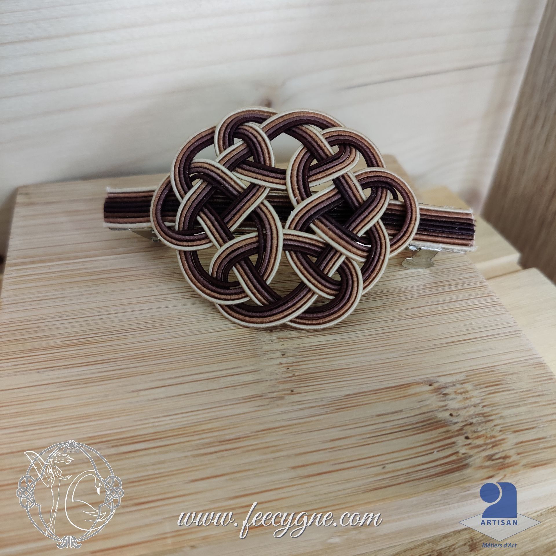 ✢ J’ai réalisé ici les nœuds qui ornent les barrettes à cheveux avec des cordelettes de papier appelées Mizuhiki, qui sont fabriquées de façon artisanale au Japon. Ici, c'est un noeud Kesa, qui s'apparente au noeud cercle de vie celte.