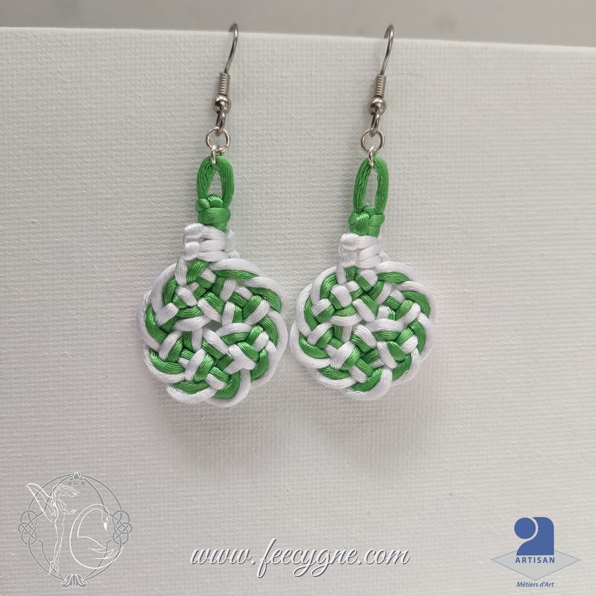 Boucles d'oreilles en noeud cercle de vie en cordon queue de rat vert et blanc