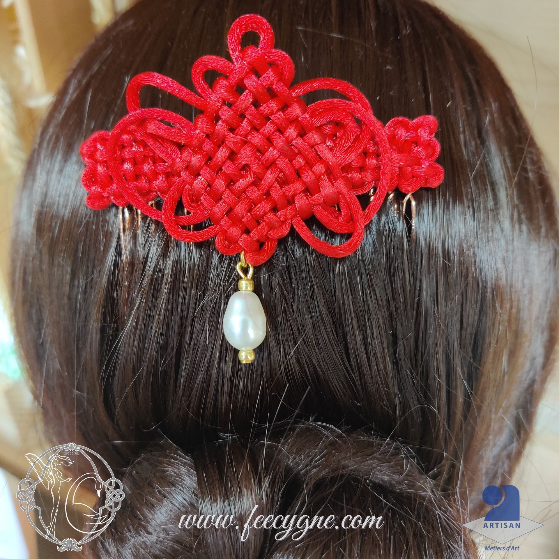 Peigne noeud Pan-Chang et perle en verre nacré