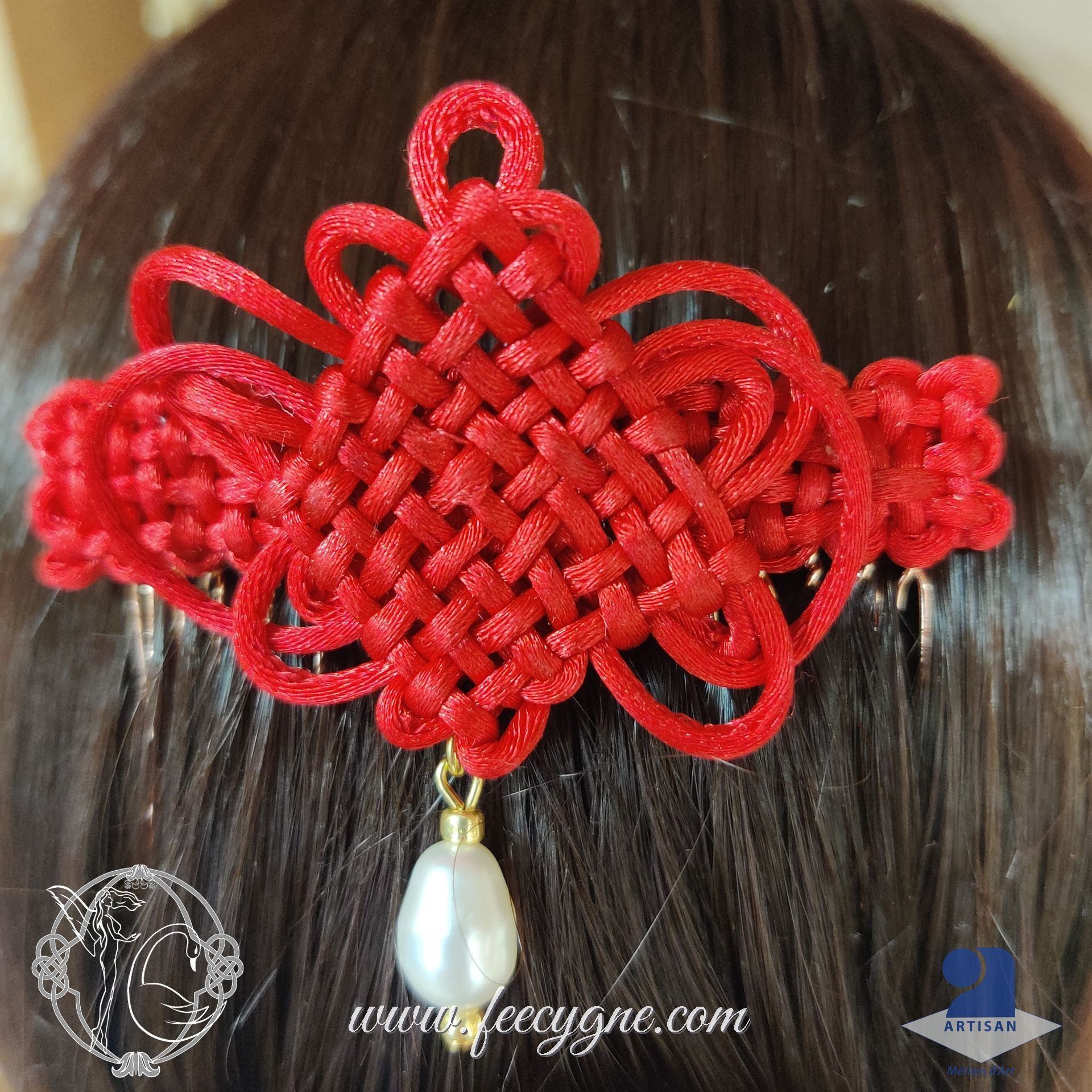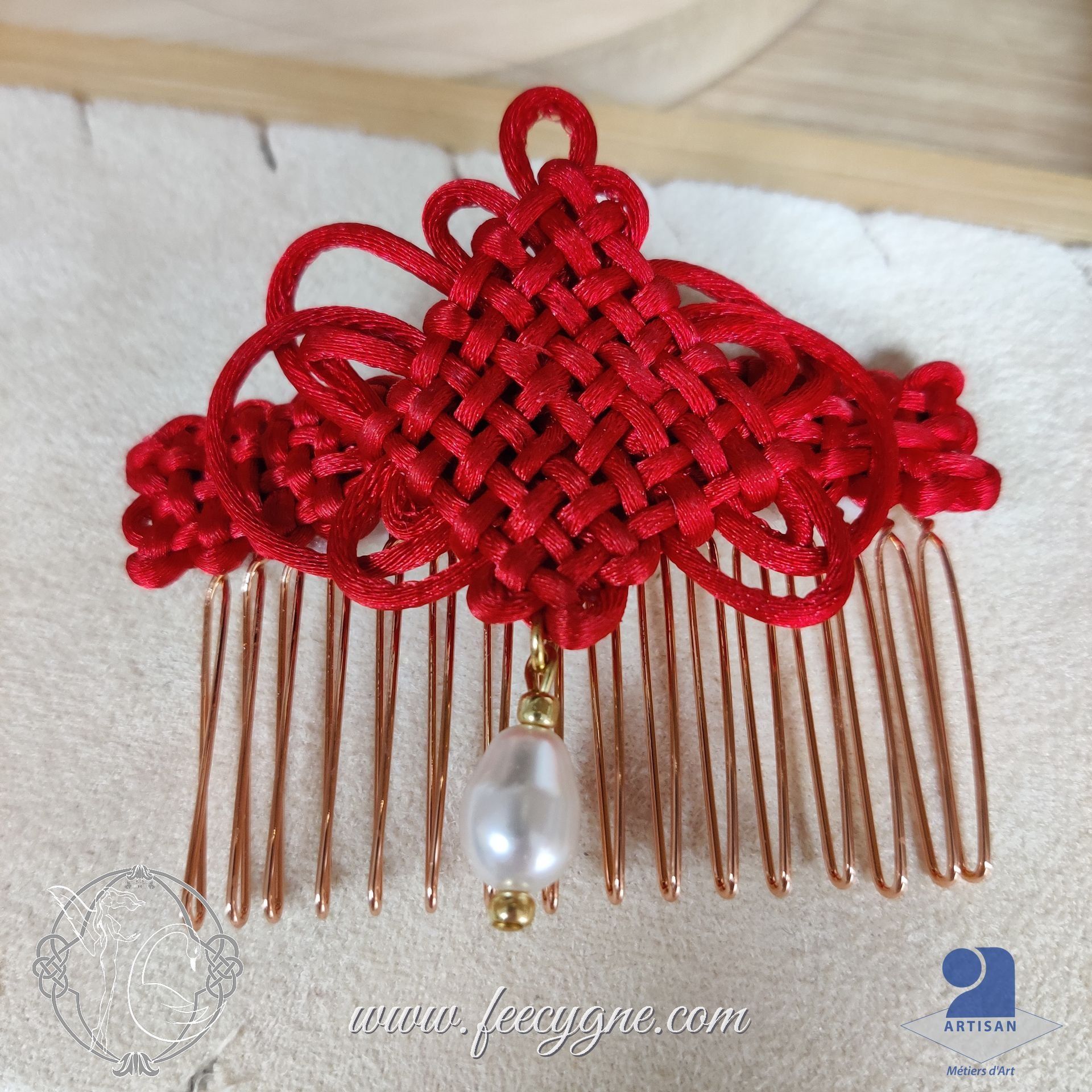 Ici, j’ai voulu vous proposer en peigne deux de ce nœud Pan chang : le noeud pan-chang à boucles, et un noeud pan-chang long en support.